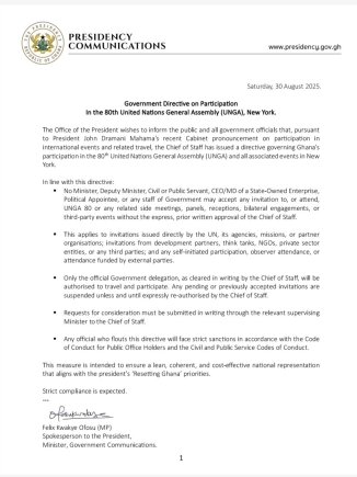 The directive, announced by the President’s Spokesperson, Felix Kwakye Ofosu, states that no Minister, Deputy Minister, Civil or Public Servant, CEO of a State-Owned Enterprise, Political Appointee, or any government staff may accept any invitation to the UNGA or associated side meetings, panels, receptions, or bilateral engagements without “the express, prior written approval of the Chief of Staff.”