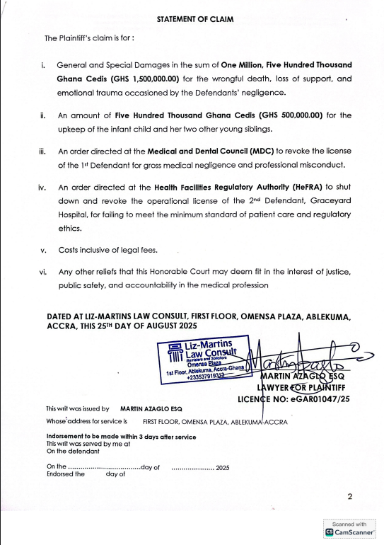 Beyond seeking financial compensation, Frimpong is urging the Medical and Dental Council to revoke Dr. Oppong’s medical license and calling on the Health Facilities Regulatory Authority to close Graceyard Hospital to prevent similar tragedies.
