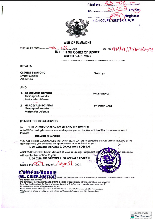 Represented by Liz-Martins Law Consult, Frimpong warns that without decisive regulatory action, avoidable deaths will continue to plague Ghana’s healthcare system. The defendants have eight days from the date of service to respond, after which the court may rule in favor of the plaintiff.